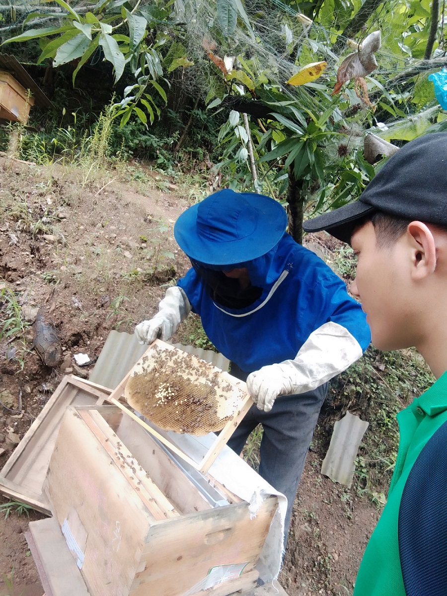 组员了解到村委会引进的蜜蜂养殖技术已经带动了部分农户致富,每年都有培训,专家手把手地教授养蜂知识与技能,现在村里还出现一位“蜂王”。得知“蜂王”的所在地之后,组员立刻前往了解情况。在访谈中,李大伯说道:“他们以前引进的蜜蜂养殖技术对于我的影响其实还是蛮大的,毕竟我也是养蜂的,但是对于一些知识我还真是不得不惊叹,网上的看起来容易,如果换成专家现场教授,那效果可就是不一样了。”看到满天飞舞的蜜蜂,伯伯脸上那可是自豪无比。