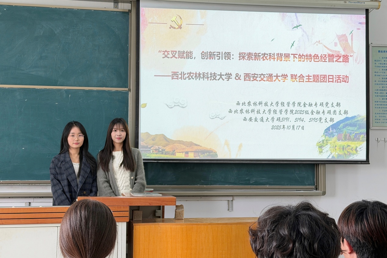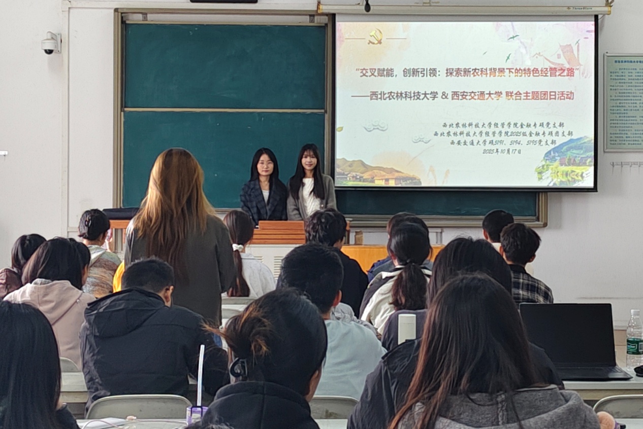 为深化学生对“新农科”与“新经管”交叉融合内涵的理解,激发创新思维探索学科交叉新路径,搭建党团支部沟通桥梁,2025年10月17日下午,西北农林科技大学2025级金融专硕团支部与西安交通大学硕5191党支部、硕5194、硕5195团支部成功开展共建交流活动。两校学子在思想碰撞与经验分享中,共探新农科背景下特色经管之路,明晰学科交叉赋能乡村振兴的实践方向。